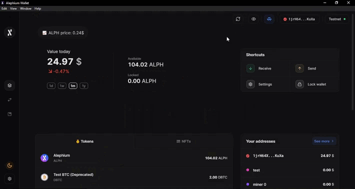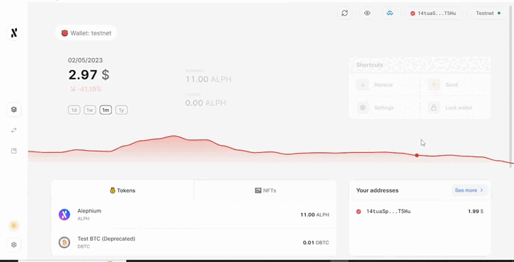 The handy overview page now includes your holdings (ALPH & tokens), your balances in the chosen network, and shortcuts to the most important actions. You can also see a chart that represents the historical value of your holdings (it will appear after 3 days of your first transaction)